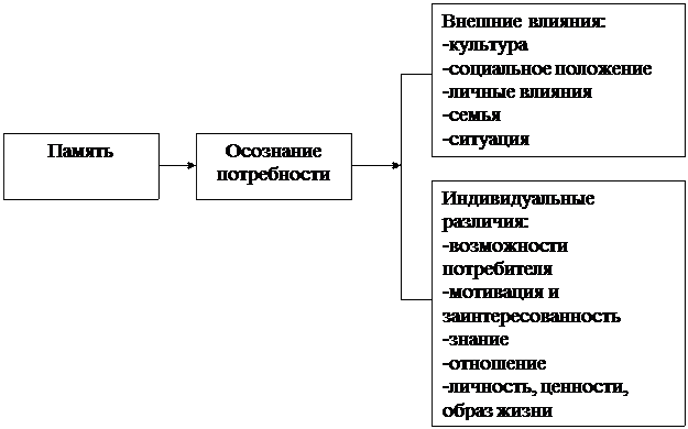 Процесс принятия решения о покупке начинается с осознания покупателем потребности или нужды — потребитель осознает разницу между реальным и желаемым состояниями. Потребность может возникнуть под действием внутренних раздражителей, когда такие естественные человеческие потребности, как голод, жажда, становятся настолько настоятельными, что превращаются в побуждение.