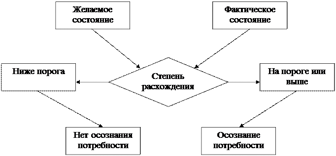 Процесс осознания потребности во многом зависит от того, насколько велико расхождение между фактическим состоянием потребителя и желаемым, в котором потребителю хотелось бы оказаться. Когда это расхождение достигает определенного уровня или превышает его, потребность осознана. На рис. 36 приведен процесс осознания потребности.