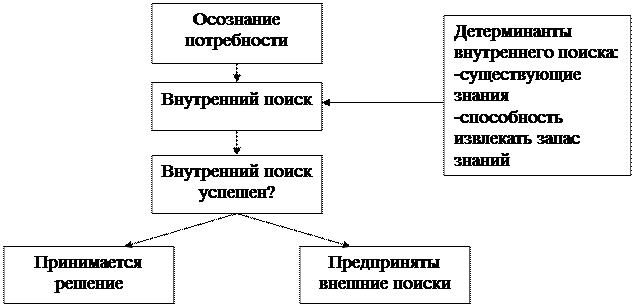 Когда осознание потребности произошло, потребитель занимается поиском способов ее удовлетворения. Поиск можно определить как мотивированную активизацию знаний, хранящихся в памяти, или приобретение информации из внешней среды. Согласно этому определению поиск по своему характеру может быть либо внутренним, либо внешним. Внутренний поиск включает извлечение знаний из памяти, тогда как внешний поиск состоит в сборе информации на рынке.