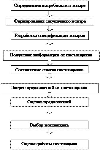 Вначале организация определяет потребность в товаре, затем формирует закупочный центр, который разрабатывает спецификации товара для удовлетворения этой потребности.