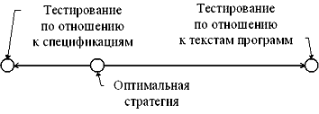 Оптимальная стратегия проектирования тестов расположена внутри интервала между этими крайними подходами, но ближе к левому краю. Она включает проектирование значительной части тестов по спецификациям, исходя из принципов: на каждую используемую функцию или возможность - хотя бы один тест, на каждую область и на каждую границу изменения какой-либо входной величины - хотя бы один тест, на каждый особый случай или на каждую исключительную ситуацию, указанные в спецификациях, - хотя бы один тест. Но она требует также проектирования некоторых тестов и по текстам программ, исходя из принципа (как минимум): каждая команда каждой программы ПС должна проработать хотя бы на одном тесте.
