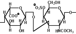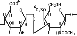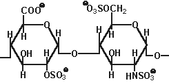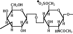 | Гепарин и гепаран сульфаты: состоят из D-глюкуронат -2-сульфата (или идуронат-2-сульфата) + N -сульфо-D-глюкозамин-6-сульфата Связь (1, 4) (гепараны менее сульфированы чем гепарины) |