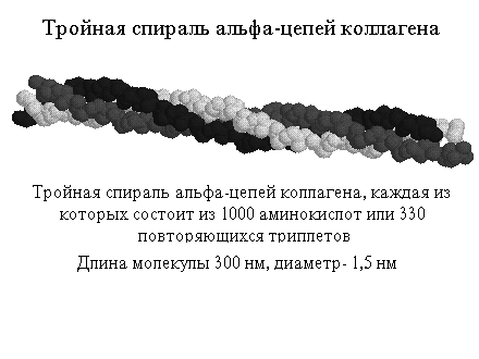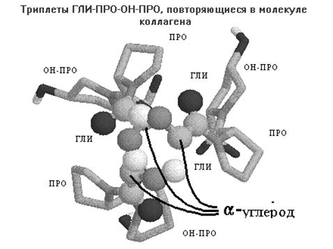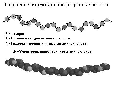 Общие принципы организации молекул коллагенов хорошо прослеживаются в наиболее хорошо изученном коллагене кожи. На уровне первичной структуры каждую третью позицию в его полипептидной цепи занимает глицин. Наиболее популярной последовательностью аминокислотных остатков является трипептид ГЛИ-X-Y, где положение X и Y могут занимать любые аминокислоты. Чаще всего встречаются ПРО и гидроксиПРО. Кроме того, в этих местах может находиться ЛИЗ или гидроксиЛИЗ. Водородные связи, характерные для a спиралей, в коллагене не образуются.