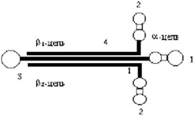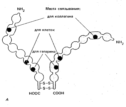 1 - места соединения с клетками; 2 - места соединения с коллагеном IV типа; 3 - место связывания с гепарансульфатом; 4 - место связывания с гепарином.