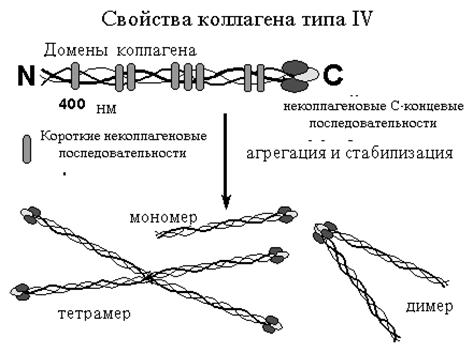 Из-за дополнительных неколлагеновых доменов на N- и C-концах полипептидов, образующих коллаген типа IV, его молекула длиннее (400 нм), чем у других коллагенов, формирующих фибриллы (300 нм). Двумерная сеточка этого коллагена - компонент внеклеточного матрикса или базальной мембраны, которая служит поверхностью для прикрепления большинства эндотелиальных и эпителиальных клеток или окружает мышечные и жировые клетки.