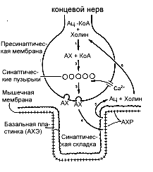 Часть нервного окончания расположена в тесном соседстве с мышечной концевой пластинкой. Весь процесс, посредством которого АХ стимулирует свой рецептор, можно разделить на 6 этапов (см. текст). Ац - ацетил; КоА - кофермент А; АХ - ацетилхолин; АХЭ - ацетилхолинэстераза; АХР - ацетилхолиновый рецептор.