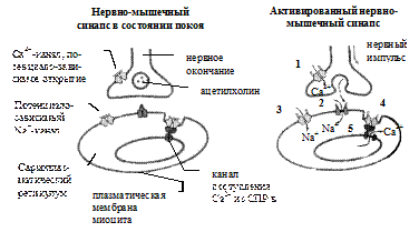 В состоянии покоя, таким образом, спонтанно и единовременно высвобождается около 10000 молекул медиатора (предположительно, содержимое 1 синаптического пузырька). В результате на концевой пластинке формируются небольшие по величине потенциалы. Когда в процессе передачи нервного импульса происходит деполяризация нервного окончания, открываются потенциало-чувствительные Са2+ каналы, через которые Са2+ из синаптического пространства проникает в нервное окончание. Этот Са2+ играет важную роль в процессе экзоцитоза и высвобождения АХ в синаптическое пространство (высвобождается, приблизительно, содержимое 200 пузырьков).