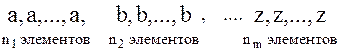 Найдем количество различных перестановок. Обозначим a, b,…, z – переставляемые объекты; nj – количество повторений j-го элемента, j = 1,…,m,
