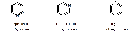 Пиридазин, пиримидин и пиразин относятся к ароматическим гетероциклам. Они содержат по два атома азота пиридинового типа и обладают основными свойствами. Протонирование диазинов осуществяется только в очень сильных кислотах, и соли образуются с участием лишь одного атома азота.
