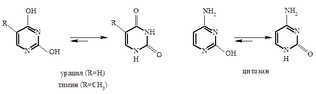Урацил, тимин и цитозин содержат гидроксильную группу в положении 2, поэтому для них, как и для 2-гидроксипиридина, характерно явление лактим-лактамной таутомерии.