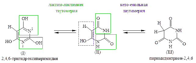 Важным представителем пиримидиновых соединений является тригидроксипроизводное, называемое барбитуровой кислотой. Подобно другим гидроксипиримидинам, барбитуровая кислота может существовать в нескольких таутомерных формах, три из которых приведены в схеме. Структуры (I) и (II) представляют соответственно лактимный и лактамный таутомеры, а структуры (II) и (III) относятся друг к другу как енольный и кетонный таутомеры.