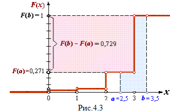 | Пример 4.2. В условиях прим.4.1 определить вероятность попадания случайной величины Х на участок [2,5; 3,5), т.е. вероятность Р {2,5 X < 3,5}.