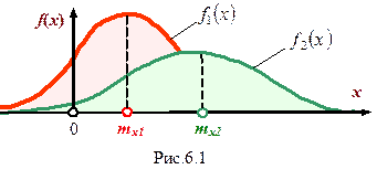 На рис.6.1. показаны две непрерывные случайные величины, заданные в виде плотности распределения и отличающиеся друг от друга математическими ожиданиями (mх 2 > mх 1).