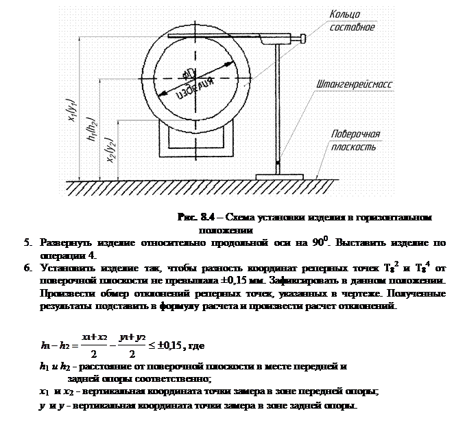 3 Положить изделие с установленными кольцами на регулируемые нивелировочные призмы с опорой на кольца (рис 8.4).Выставить изделие так, чтобы его продольная ось была расположена в горизонтальной оси.