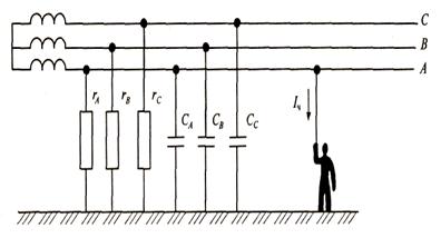 rА, rB, rC, CA, СВ, СС – соответственно омические и емкостные сопротивления изоляции фаз С, В, А относительно земли; Iч – ток, протекающий через человека