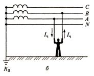 а) однополюсное прикосновение; б) двуполюсное прикосновение; C, В, A, N – фазы;