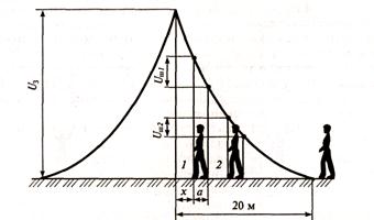 Напряжение прикосновения по мере удаления от заземлителя увеличивается и на расстоянии более 20 м становится равным фазному напряжению сети. Поражение человека электрическим током может произойти также вследствие его попадания под шаговое напряжение. В этом случае ток протекает в теле человека по пути «нога – нога». Напряжением шага называется разность потенциалов между двумя точками земли, на которые одновременно опирается человек при перемещении в поле растекания тока в земле.