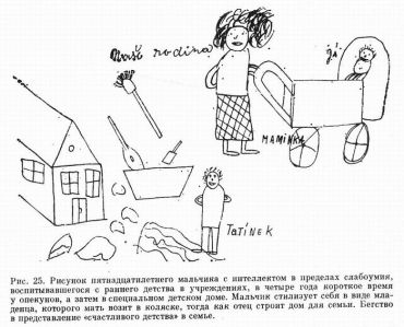 Семья в нашем современном обществе имеет центральное значение для психического развития ребенка. Здесь каждый отдельный член выполняет естественным, спонтанным образом определенную роль и удовлетворяет жизненные потребности ребенка — физические, эмоциональные, интеллектуальные и моральные. В первый период при обычных условиях — это мать, которая за ребенком не только ухаживает, но и предоставляет ему первые интенсивные эмоциональные стимулы, нянча его на руках, лаская, улыбаясь ему и разговаривая с ним. Роль отца, представляющего определенный пример поведения, а также источник уверенности и авторитета, осознается в более позднем возрасте, но она существенна уже в ранние годы жизни ребенка. Нельзя обходить также значение братьев и сестер. Общая атмосфера семьи, которая интенсивно формирует развивающуюся личность ребенка, находится в очевидной зависимости от непрестанного тесного контакта в совместной жизни всех этих членов семьи. Следовательно, если в семье отсутствует какой-либо основной член, то легко возникает опасность депривации для ребенка, так как не всегда можно заместить роль, которую данный член семьи должен был бы выполнять в отношении ребенка и в отношении всей семейной единицы. Период, когда подобным образом выбыла одна составная часть (с момента рождения или позднее, временно или постоянно), а также причина такой диссоциации (ребенок одинокой матери, смерть, служба в армии и военные события, развод) определяют затем дальнейшие условия депривации и возможных сопровождающих конфликтов, способствуя таким образом созданию окончательной клинической картины.