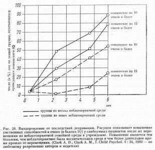 Подобная проблема грозной физической и нравственной нужды, царствующей на периферии избытка и роскоши, нашим работникам в такой форме неизвестна, однако до сих пор нам приходится иметь дело с отдельными случаями подобной неблагоприятной физической и психической заботы. Оставлять ребенка лишь во имя «материнского ухода» и из-за опасений перед последствиями сепарации там, где серьезно запускают заботу о нем, подвергают побоям, недоеданию, пребыванию в грязи, было бы, конечно, совершенно нереалистичным. Целый ряд детей расцветает у нас почти на глазах, когда из подобной семейной среды их помещают в более благоприятные условия детского учреждения. В нашем материале также имеются доказательства, что такие дети начинают затем вскоре ходить, говорить, прибавлять в массе тела, у них изменяется настроение, они становятся более спонтанными и инициативными и т. д. Кларк Л. Д., Кларк А. М. и С. Рейман (рис. 26) в ряде исследовательских работ показали, как маленькие, умственно отсталые дети, проживающие в весьма плохих семейных условиях, начинают быстро прогрессировать в интеллектуальном развитии, если их взять из семей, особенно же в первый период после помещения в новую среду.