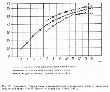 Хотя объяснение подобный результатов и не является простым и хотя следует допустить возможность, что на результаты оказывали влияния конструкция тестов (которые в более старшем возрасте охватывают больший объем знаний, предоставляя так лучшие возможности для детей с хорошим доступом к образованию) и селективная миграция (переход более энергичных и сообразительных лиц в города), все же сопоставление результатов и соответствие с цитируемыми выше лонгитюдинальными исследованиями свидетельствуют в пользу решающего неблагоприятного влияния семейной среды на развитие умственных способностей ребенка. Если ребенок регулярно посещает школу, то ее воспитательное влияние может частично уравновесить неблагоприятное воздействие семьи, так как помимо прочего означает и частичную сепарацию. Об этом свидетельствуют данные Г. Гетцер (рис 27), которая в книге «Kindheit ind Armut» (1937) uустанавливала запаздывание на 1—2 года у школьников с плохими семейными условиями по сравнению с детьми из благополучных семей, а также постепенное уменьшение данного различия в процессе посещения школы.