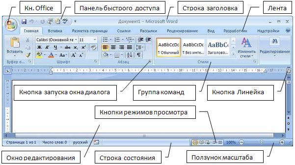 Основным средством для работы с содержимым документа в окнах приложений Microsoft Office 2007 является Лента. Это новый принцип организации графического интерфейса приложений Microsoft Office, который предполагает новую логику работы с приложениями. Пользовательский интерфейс Microsoft Office 2007, который интуитивно более понятный, чем меню и панели инструментов, обеспечивает быстрый доступ к командам через такие средства, как Лента с вкладками, где команды организованы в группы по выполняемым действиям.