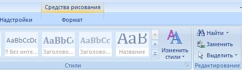 Кроме того, в приложениях Microsoft Office 2007 применяются такие наборы команд как контекстные инструменты, вкладки которых появляются на Ленте при работе с определенным объектом в документе. Так, например, если вставить и выделить объект Фигура в документе Microsoft Word 2007, то появятся контекстные инструменты, называемые Средства рисования, и вкладка Формат на Ленте, представленные на Рис. 2.