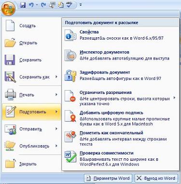 Для управления документом в целом (для управления файлом) применяются команды собранные в меню Файл, которое открывается щелчком на кнопке Office (кнопка с логотипом Microsoft Office). Структура и функциональность меню Microsoft Office 2007 отличается от меню Файл предыдущих версий Microsoft Office. Меню состоит из двух панелей, на левой панели отображаются группы команд для работы с файлами, а на правой панели – список команд, содержащихся в выделенной группе команд (Рис. 4.). В нижней области меню расположена кнопка Параметры для настройки приложения.