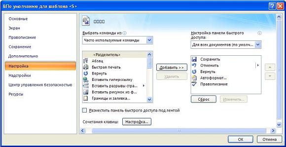 Для размещения дополнительных инструментов на Панель быстрого доступа Microsoft Word 2007 необходимо щелкнуть на кнопке Настройка панели быстрого доступа расположенной справа от панели. В открывшемся меню надо выбрать "Другие команды", откроется окно "По умолчанию для шаблона" (Рис. 5), в котором, щелкнув на команде Настройка, можно осуществить настройку панели быстрого доступа.