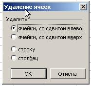 - пункт меню "Правка" → "Удалить…" и пункт контекстного меню "Удалить…" приведет к открытию окна "Удаление ячеек".