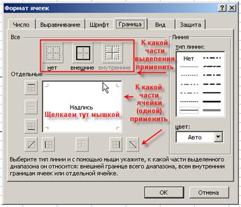 - окно "Формат ячеек", закладка "Граница":