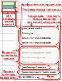 Если потянуть за маркер правой кнопкой, после ее отпускания откроется контекстное меню, в котором можно найти дополнительные команды для копирования оформления ячеек, создания прогрессий и последовательностей дат: