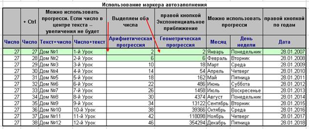 - Создание различных встроенных в Excel последовательностей (названия месяцев, дней недели, даты, время);