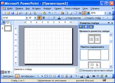 1. В открытом приложении PowerPoint выполнить команду Файл/Создать, а в области задач выбрать команду «Новая презентация». В результате этих действий в области задач откроется панель «Разметка слайда».