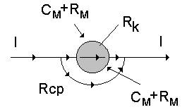 Путь через клетку сопротивлением содержимого клетки Rк, а также сопротивлением и ёмкостью мембраны.Rм, См.