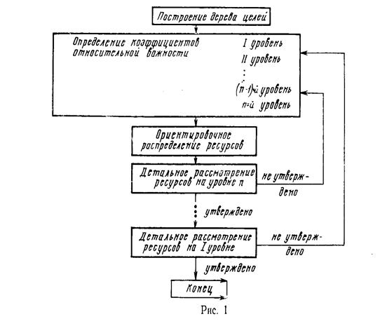 Далее происходят ориентировочное распределение ресурсов в соответствии с коэффициентами относительной важности, детальное рассмотрение распределения ресурсов по уровням и корректировка коэффициентов относительной важности при движении снизу вверх по уровням дерева целей.