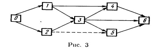 Первым шагом при составлении сетевой модели является расчленение данного комплекса на отдельные работы, в результате чего появляется перечень (список) работ. Одним из важнейших показателей для каждой работы является ее продолжительность. Следующий важный шаг в процессе составления сетевой модели – выявление всех технологических связей, которые существуют между отдельными работами и показывают последовательность выполнения работ. После выявления всех связей можно в перечне около каждой работы записать номера предшествующих ей работ. Факт начала (окончания) некоторой работы будем называть событием. Имея перечень работ, технологических связей и событий, можно составить сетевой график на языке работ и событий (рис. 3).