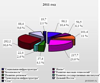 Из данных диаграмм следует, что финансирование социальной инфраструктуры, развития регионов, транспортной инфраструктуры в 2011 увеличилось на 2,4, 0,6% и 0,4%. Значительное снижение наблюдается в отношении «Жилья» (2,9%) и «Села» (0,4%).