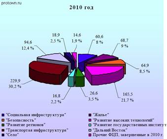 Объем ассигнований федерального бюджета, направленный на реализацию ФЦП, сократится с 922,1 млрд. рублей в 2011 году до 847,6 млрд. рублей в 2012 году, или на 74, 5 млрд. рублей (на 8,1 %), а их доля в общем объеме расходов - с 9,8 % до 9,0 %.