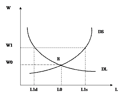 Кривая спроса на труд DL отражает спрос на труд со стороны предпринимателей. Кривая предложения труда DS отражает его величину в связи с изменением уровня заработной платы. Если уровень оплаты труда будет повышен с точки W0 до точки W1, это, с одной стороны, приведет к сокращению спроса на труд до величины L1d, т. е. к увольнению части наемных работников, с другой стороны, это приведет к увеличению предложения на труд на величину (L1s-L0). Возвращение в точку равновесия Е приведет к исчезновению безработицы: весь спрос на труд будет удовлетворен его предложением при данной цене труда на уровне точки W0. Вывод из закона Ж. Б. Сэя достаточно ясен и прост: причина безработицы – чрезмерно высокий уровень заработной платы.