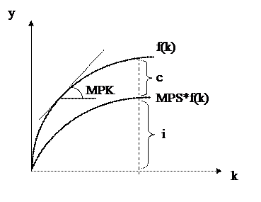 Производственная функция определяет предложение на рынке товаров, а накопление капитала - спрос на произведенный продукт. Динамика объёма выпуска зависит от объёма капитала (в нашем случае - капитала в расчете на одного занятого, или капиталовооруженности). Объём капитала меняется под воздействием инвестиций и выбытия: инвестиции увеличивают запас капитала, выбытие - уменьшает.