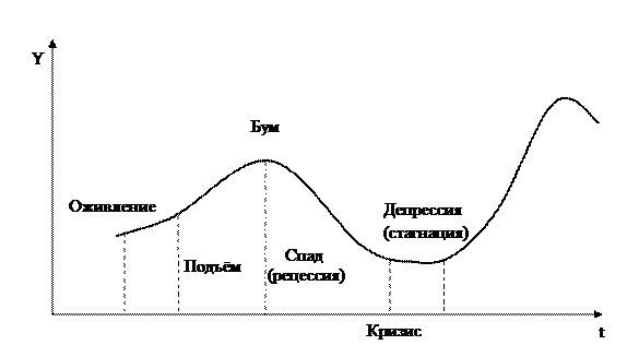 Цикл представляет собой интервал времени в развитии рыночной экономики, в течение которого происходит увеличение объема производства товаров и услуг, а затем сокращение, спад, депрессия, оживление и, наконец, снова его рост (рис. 1).