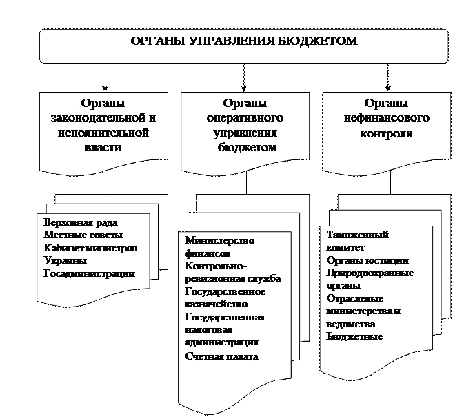 К первой группе относятся органы законодательной и исполнительной власти (Верховная Рада – ведущий орган в управлении бюджетом). Местные бюджеты утверждаются местными законодательными органами. Органы исполнительной власти (Кабинет Министров Украины, госадминистрации) обеспечивают подготовку проекта соответствующего бюджета и его исполнения.