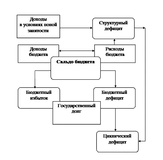 Различают структурный и циклический дефицит. Структурный дефицит представляет собой разность между текущими государственными расходами и доходами, которые могли бы поступить в бюджет в условиях полной занятости при существующей системе налогообложения.
