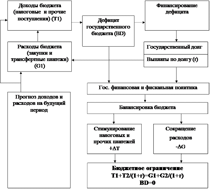 Государственное бюджетное ограничение показывает, как нынешние изменения в бюджетно-налоговой политике связаны с изменениями политики в будущем. Если правительство сокращает налоги первого периода без сокращения закупок, то оно входит во второй период с долгом по государственным облигациям. Наличие этого долга вынуждает правительство выбирать между сокращением закупок и повышением налогов.