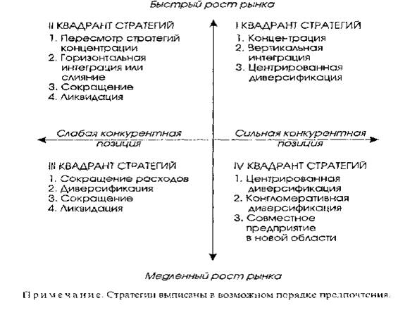 Томпсон и Стрикланд (р.97) предложили следующую матрицу выбора стратегии в зависимости от динамики роста рынка на продукцию (услугу) (эквивалент росту отрасли) и конкурентной позиции фирмы (рис. 8.2).