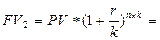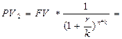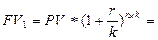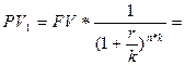 | PV – сумма денежных средств, предназначенная для инвестирования, руб. r – ставка процента (темп прироста денежных средств), % n – число периодов, лет k – количество начислений процентов в периоде. | |||||