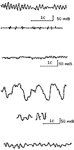 Кроме того, описаны сверхмедленные потенциалы, имеющие период колебаний от нескольких секунд до нескольких часов и амплитуду от сотен микровольт до десятков милливольт. Эти потенциалы составляют 5 групп: 1 - секундные с периодом колебания от 3 до 10 сек., 2 -декасекундные с периодом 15-60 сек., 3 - минутные с периодом 2-9 мин., 4- декаминутные с периодом 10-20 мин., 5 - часовые с периодом 0,5 -1,5 часа. Подобные колебания имеют место и при бодрствовании, и во время сна, при извлечении энграмм из памяти, при действии фармакологических веществ, а также при патологии мозга.
