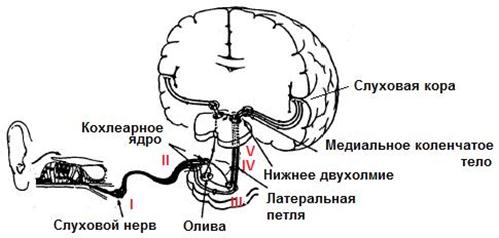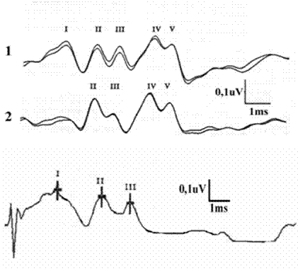 По ЛП его компоненты делятся на три группы: потенциалы ствола мозга (с ЛП до 10-12 мс), среднелатентные (до 50 мс) и длиннолатентные (более 100 мс). Звуковые ВП состоят из 7 отклонений. Волна I зависит от реакции волокон слухового нерва улитки. Волна II с латенцией 3,8 мс возникает в том случае, если импульсы слухового нерва достигают ствола мозга. Волна III отражает реакцию верхней оливы на уровне моста. Волна IV с латенцией около 4,5 мс связана с активностью латеральных лемнисков. Волна V имеет латенцию около 5,2 мс и отражает активность нижнего двухолмия. Фазы VI-VII – распространение сигналов по таламо-кортикальной радиации, они совпадают с медленной негативностью, предшествующей корковому ответу. Ранние компоненты нечувствительны к сну, наркозу. Они вызываются звуковыми тонами частотой 2000-4000 Гц. Звуки на частоте ниже 2000 Гц вызывают только волну V.