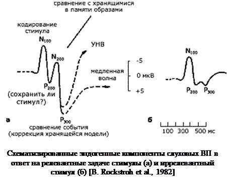 Длиннолатентные ответы включают компонент Н1 с латенцией пика в 100 мс. Потенциал характеризуется полимодальностью и чувствительностью к активации. Кроме того, на него может накладываться другой потенциал – негативность рассогласования (HP), которую связывают с процессами предвнимания. Компонент П2 имеет специфические и неспецифические составляющие. Волна Н2 также включает несколько компонентов.
