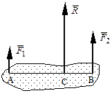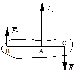 Равнодействующая двух действующих на абсолютно твердое тело параллельных сил, направленных в одну сторону, равна по модулю сумме модулей слагаемых сил, им параллельна и направлена в туже сторону. Линия действия равнодействующей проходит между точками приложения слагаемых сил на расстояниях от этих точек, обратно пропорциональных этим силам.